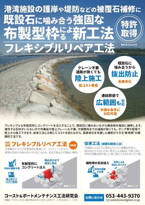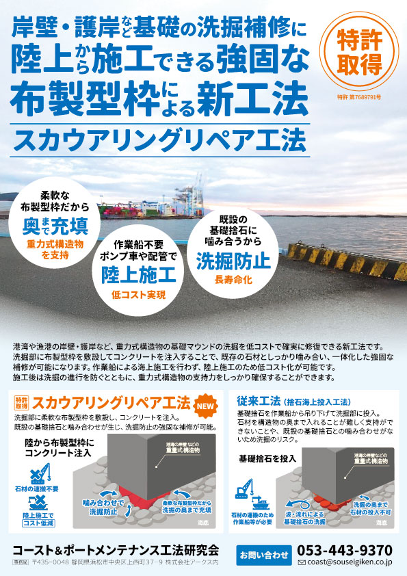 護岸や港湾の洗掘補修の新たな工法のため、専門家以外にも意図が伝わるように、わかりやすい図解や写真を用いています。